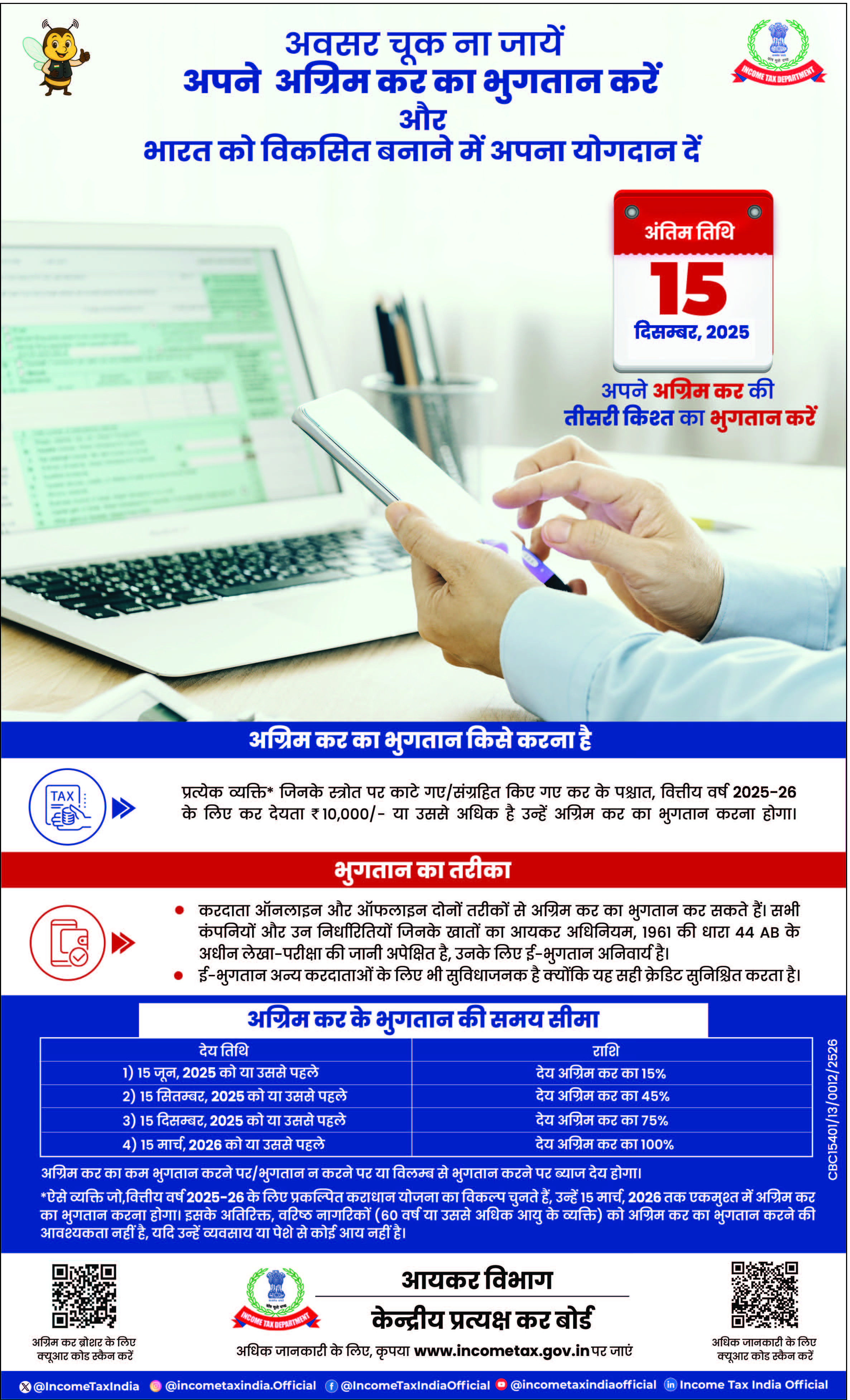आयकर विभाग कभी भी र्इ-मेल के माध्यम से आपके क्रेटिड कार्ड, बैंक अथवा अन्य वित्तीय खातों के पिन नंबर, पासवर्ड अथवा समकक्ष प्रकार की प्रयोग की जा सकने वाली सूचना की मांग नही करता है।