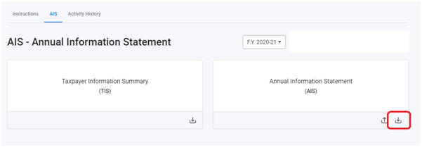 चरण 5: 'एआईएस' के अगले टैब पर क्लिक करें। पुनर्निर्देशित स्क्रीन पर, दो टाइलें दिखाई देंगी - करदाता सूचना सारांश (टीआईएस) और वार्षिक सूचना विवरण (एआईएस)। ड्रॉप-डाउन से प्रासंगिक वित्तीय वर्ष का चयन करें और जानकारी देखने के लिए एआईएस टाइल पर क्लिक करें।