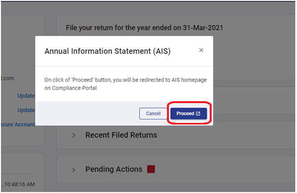 चरण 4: अगली स्क्रीन वार्षिक सूचना विवरण (एआईएस) और करदाता सूचना सारांश (टीआईएस) से संबंधित मुख्य निर्देश प्रदान करती है। टीआईएस श्रेणीवार एआईएस में उपलब्ध सूचना को प्रदर्शित करता है। यह मूल मूल्य के साथ-साथ संशोधित मूल्य (यानी, करदाता की प्रतिक्रिया के बाद संसाधित मूल्य) दिखाता है। टीआईएस में संशोधित मूल्यों का उपयोग विवरणी को पहले से भरने के लिए किया जाता है।
