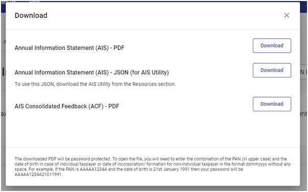 मान लीजिए आपने पीडीएफ प्रारूप का चयन किया है, तो डाउनलोड की गई पीडीएफ पासवर्ड से सुरक्षित होगी। फ़ाइल खोलने के लिए, आपको व्यक्तिगत करदाता के मामले में पैन (निचले मामले में) और जन्म तिथि के संयोजन या गैर-व्यक्तिगत करदाता के लिए निगमन/गठन की तिथि DDMMYYYY प्रारूप में बिना किसी के दर्ज करने की आवश्यकता होगी। अंतरिक्ष।